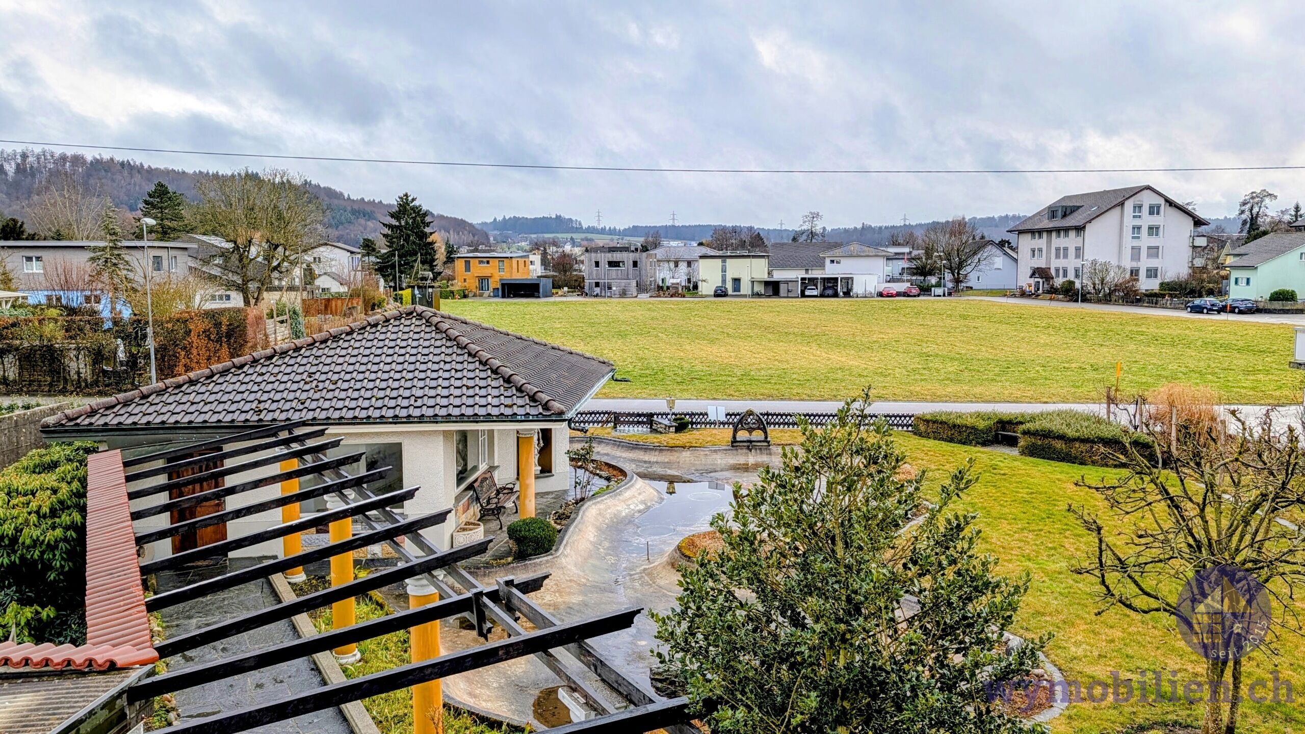 Heute mit einem grossen Teich und einem „Gartenhaus“ belegt – perfekt als grosszügige Garten-/Freizeitfläche oder für eine zukünftige Neugestaltung nach Ihren Bedürfnissen.